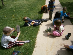 Self-help skills/developing independence. Take your boots off and squeeze out your socks!