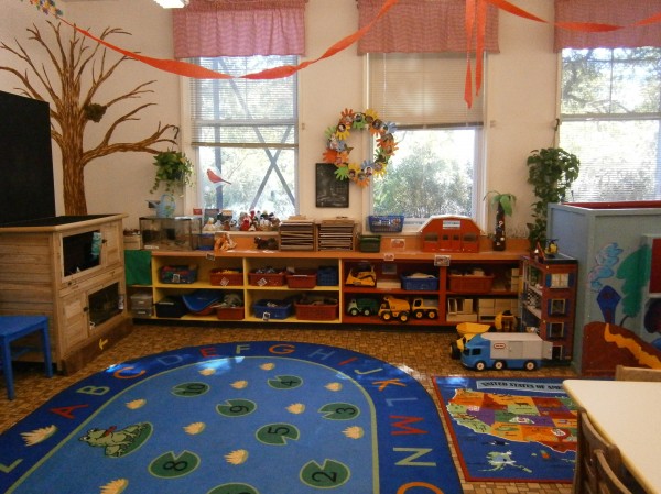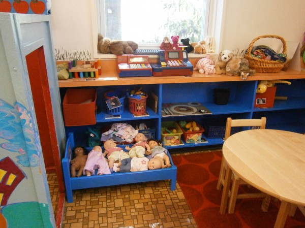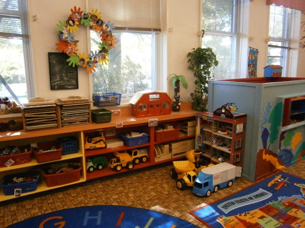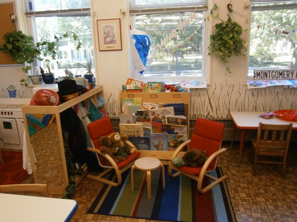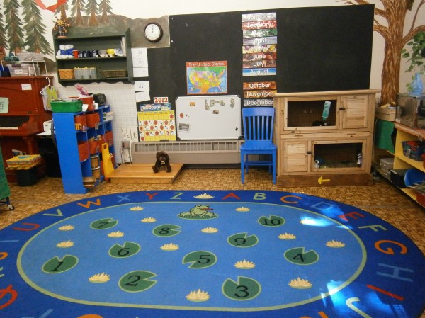 Here's where we meet as a group. The blue shelf on the left contains our musical instruments. On the back, our "jumping hoops."
