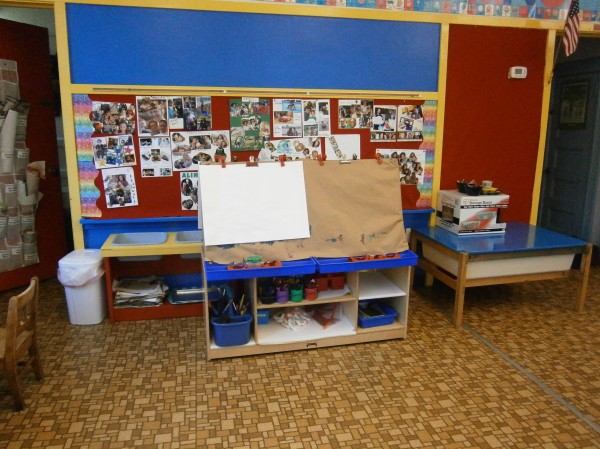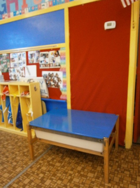 Our sensory table has a great removable top and is easily moved. The red wall is felt, and can be a flannel board or have our magnet board attached!