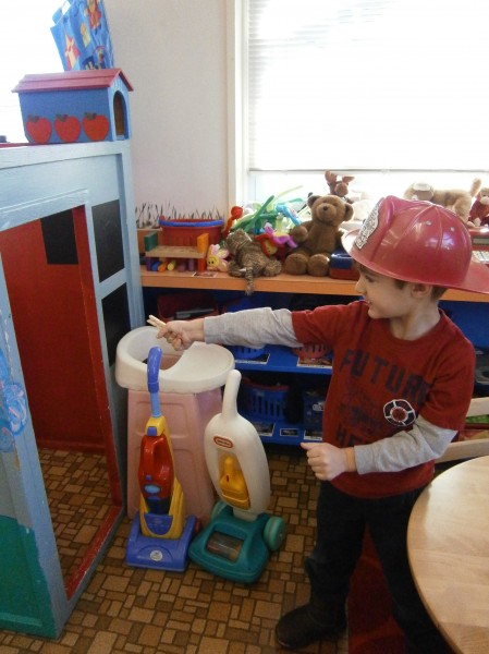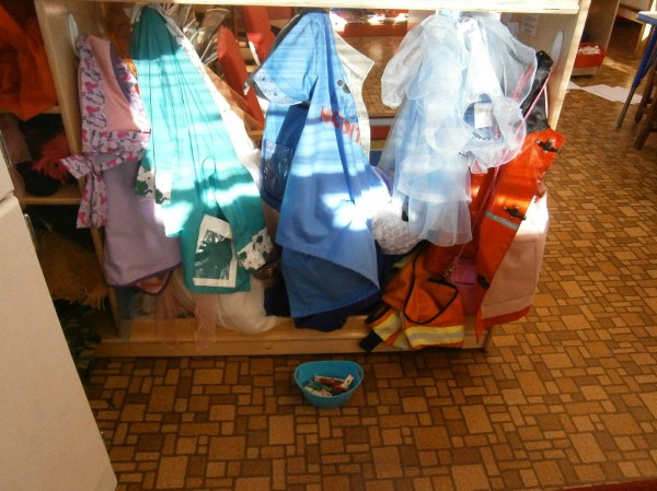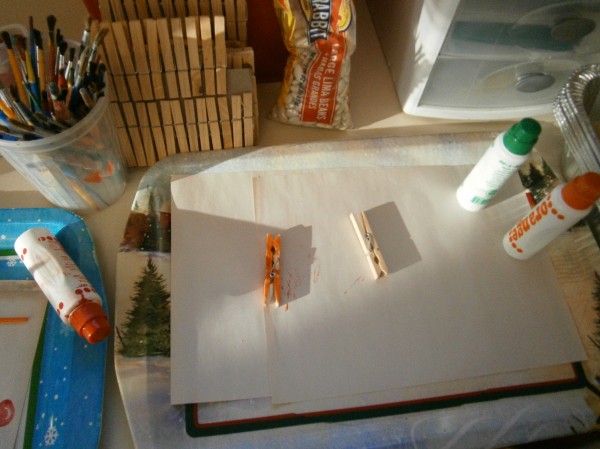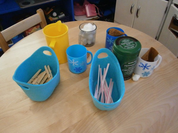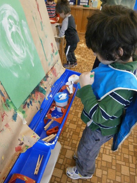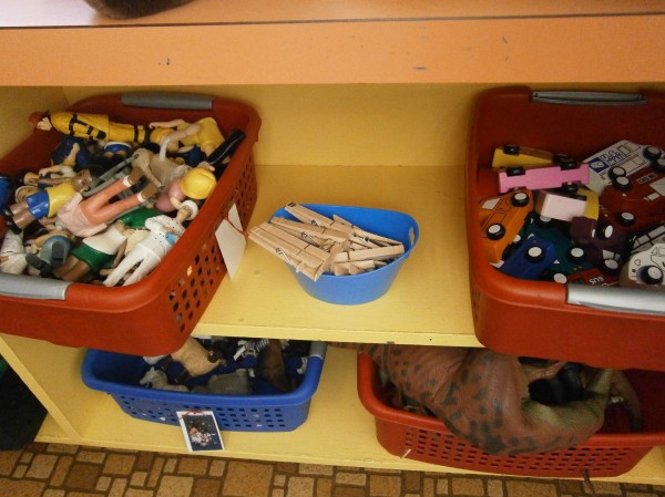 I had been planning on providing opportunities for scissor work, but I realized that I need to make sure that the children can use clothespins comfortably and competently. (Same muscle movement, helps with hand control!) But how do I get them to use them? One way… but putting them EVERYWHERE in the room!