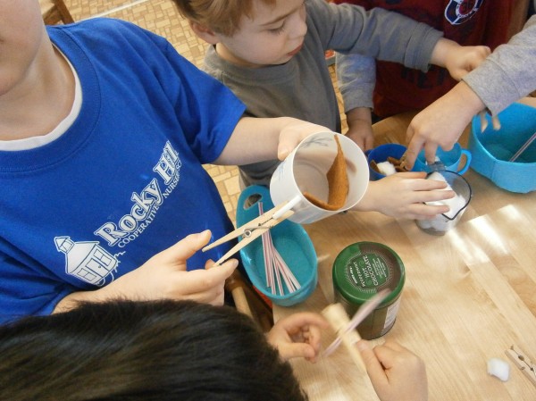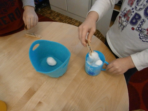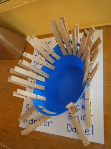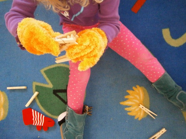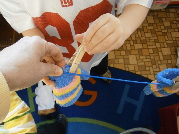 We’re pinning in preschool! No, we’re not using Pinterest. Clothespins! As I’d mentioned in the previous blog, there is a real concern that children’s hand strength is not what it was in previous years. After all, iPads, nooks, and computer don’t require a whole lot of dexterity and strength.