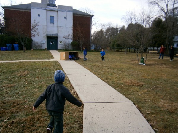 We have a very large playground at Rocky Hill Co-op. There are swings, a playscape, a sandbox, and lots of room to run. The children all go through the same stages learning to play together. The youngest ones start off running in circles yelling somewhat incomprehensibly. Children who have older siblings will teach the others how to take on roles. The older they get, the more they plan their play, and the more elaborate the play gets.
