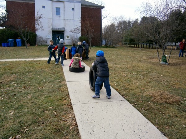 I try to provide open ended props for children to include in their play. Yesterday the weather was good and having a lot of time outside was a top priority. As I brought out some tires, one of our younger students saw them and yelled, “Look! Rolling things!”