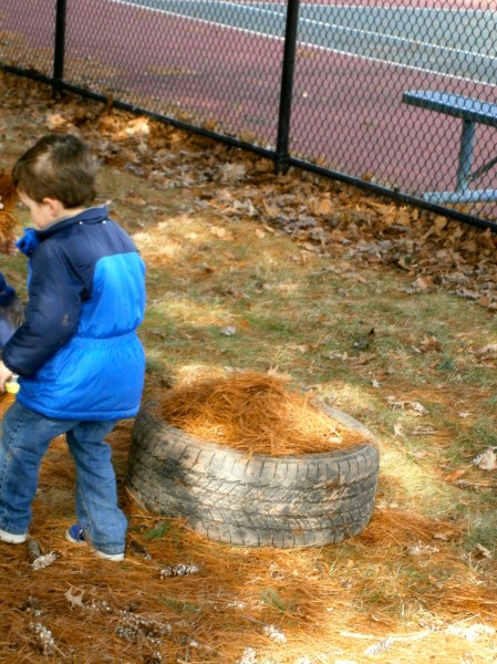 The children started to work out how to several children could use one tire. Filling a tire with pine needles was a lot of fun! (I won’t bore you with every learning objective here, but there were words like “more, not enough, higher, most and enough” bandied about!