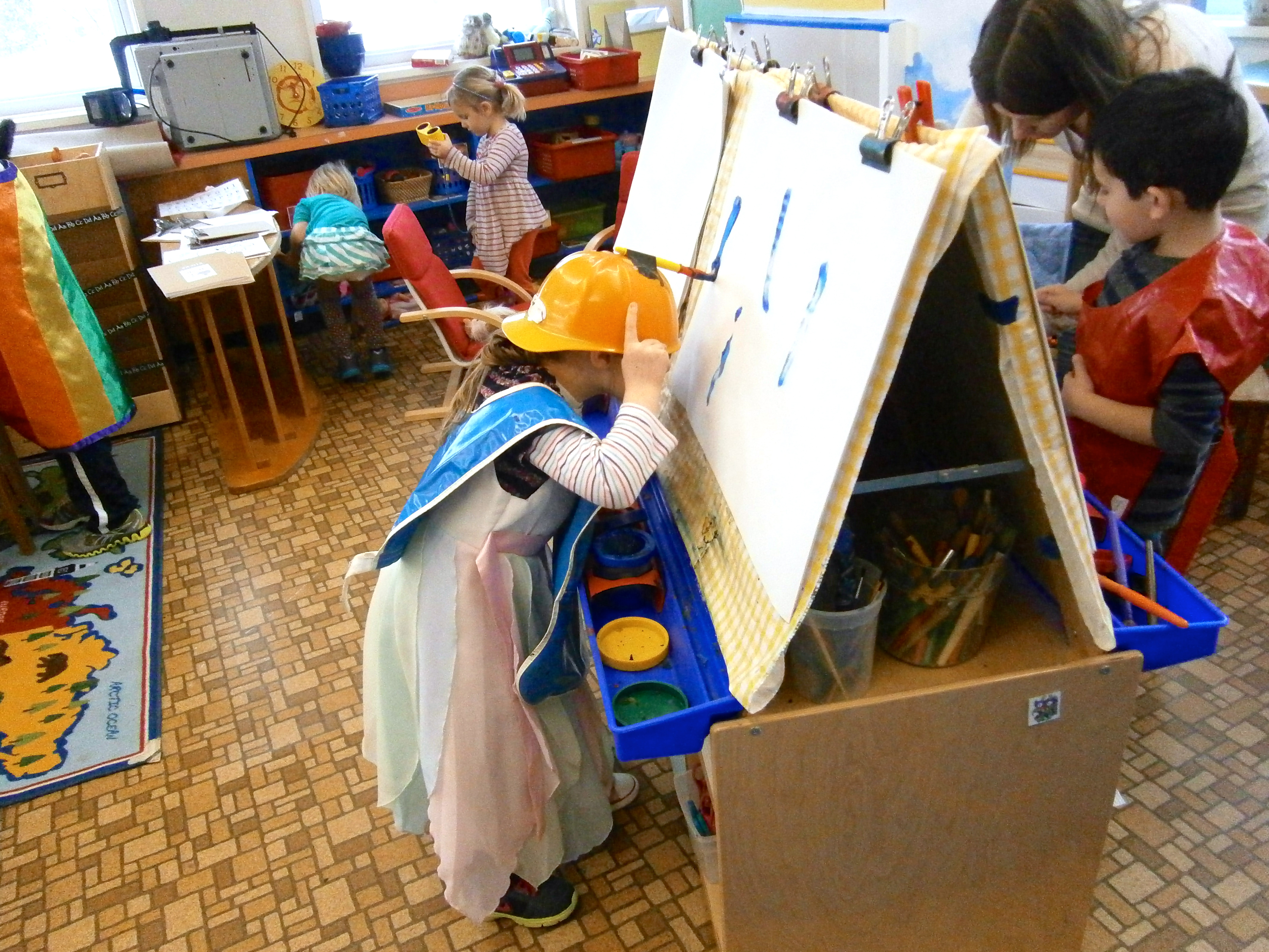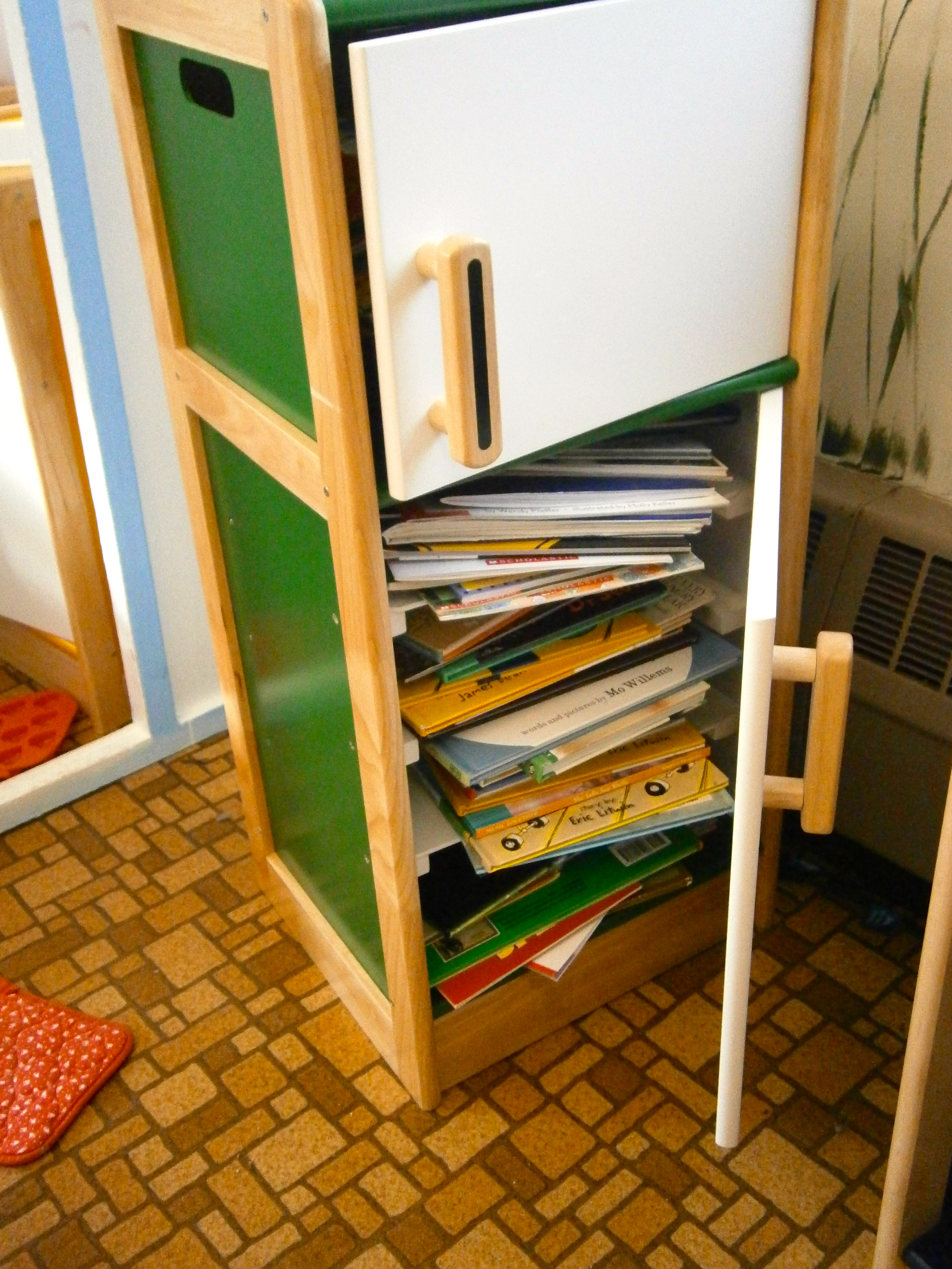 Nothing was in its usual spot: the sign-in was by the windows and the dress-up was by the door! The bookcases were full of animals and the refrigerator was full of books!