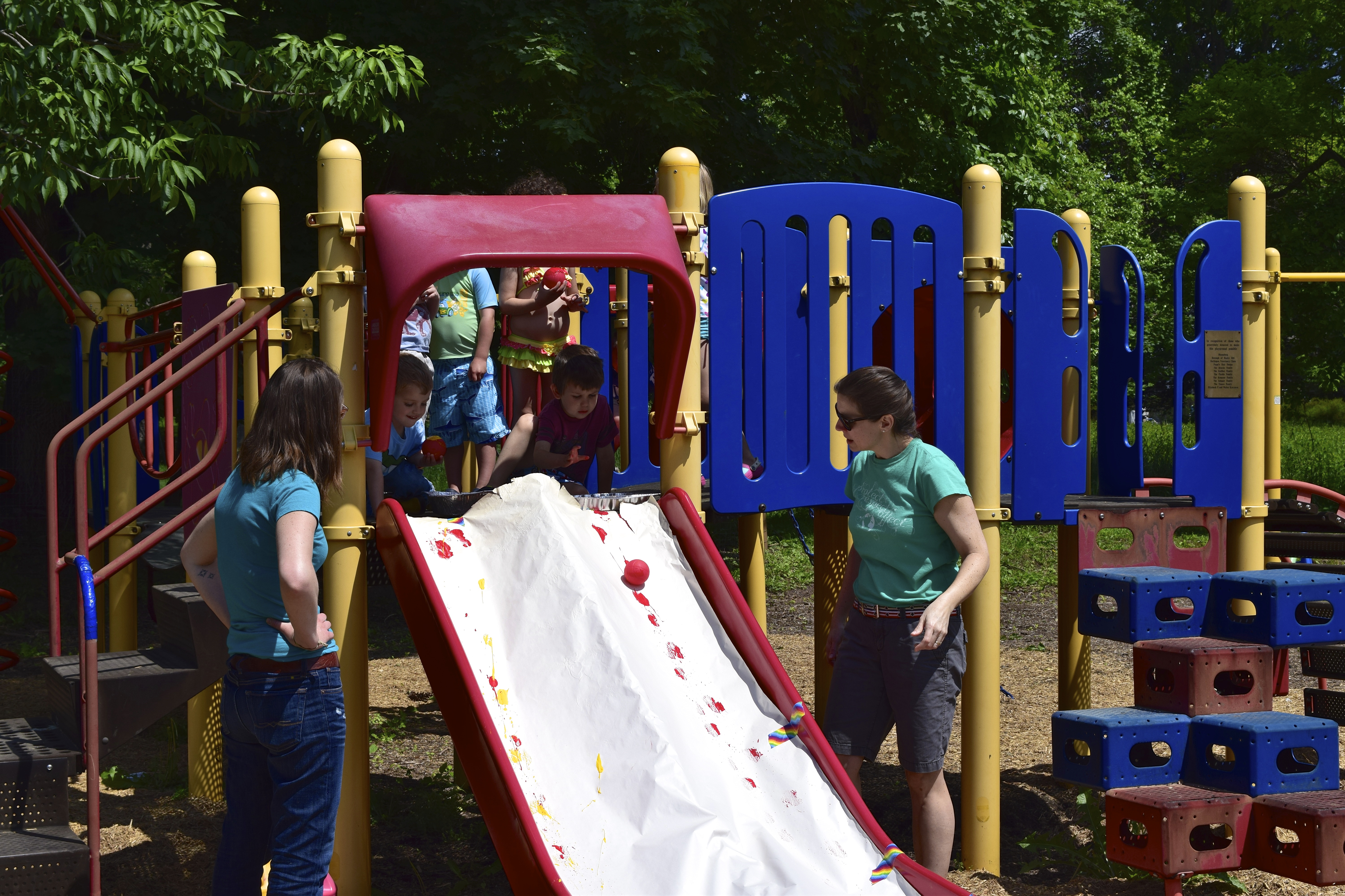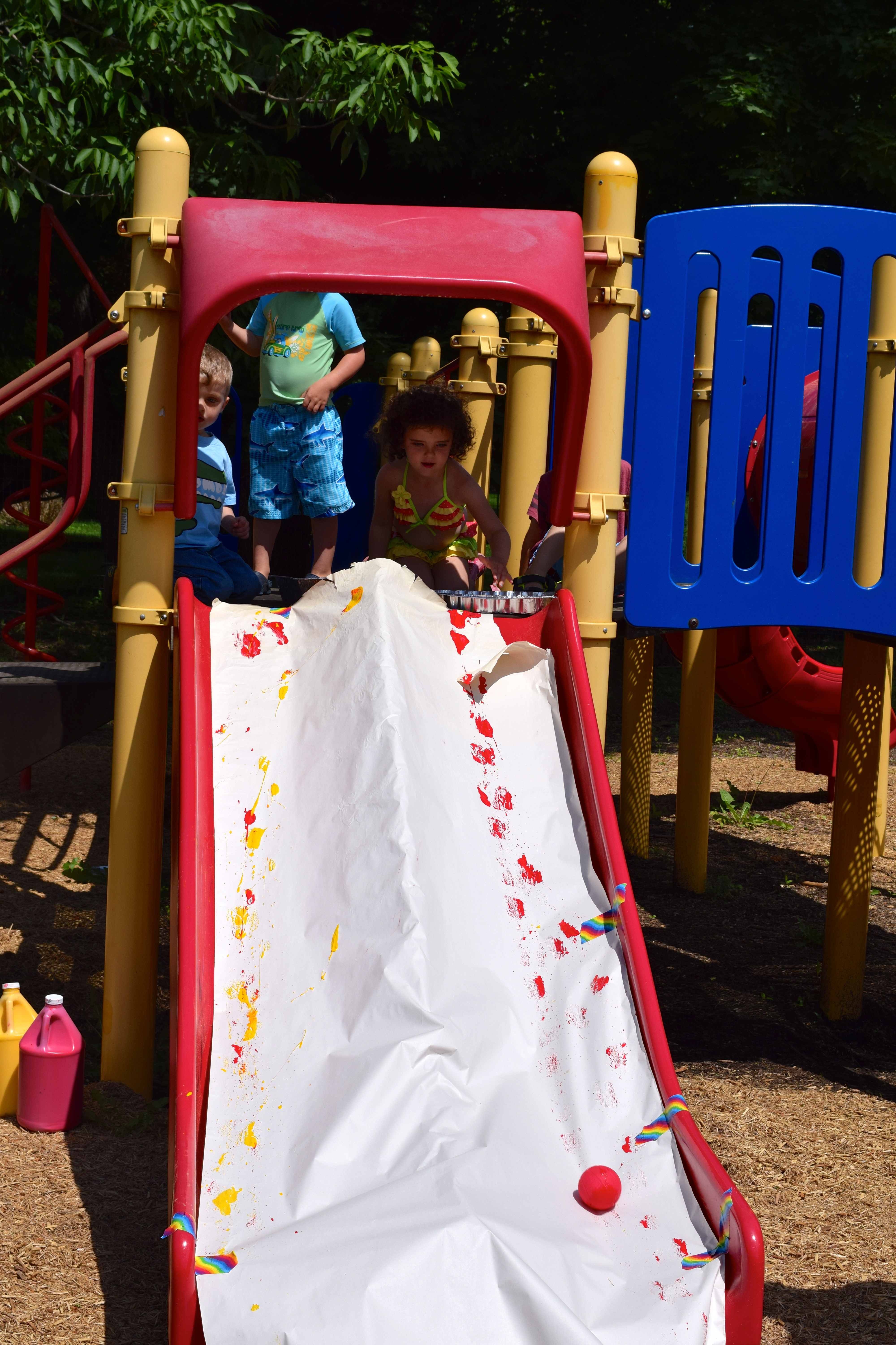 Painting on the slide! Dip balls in paint trays, and roll!