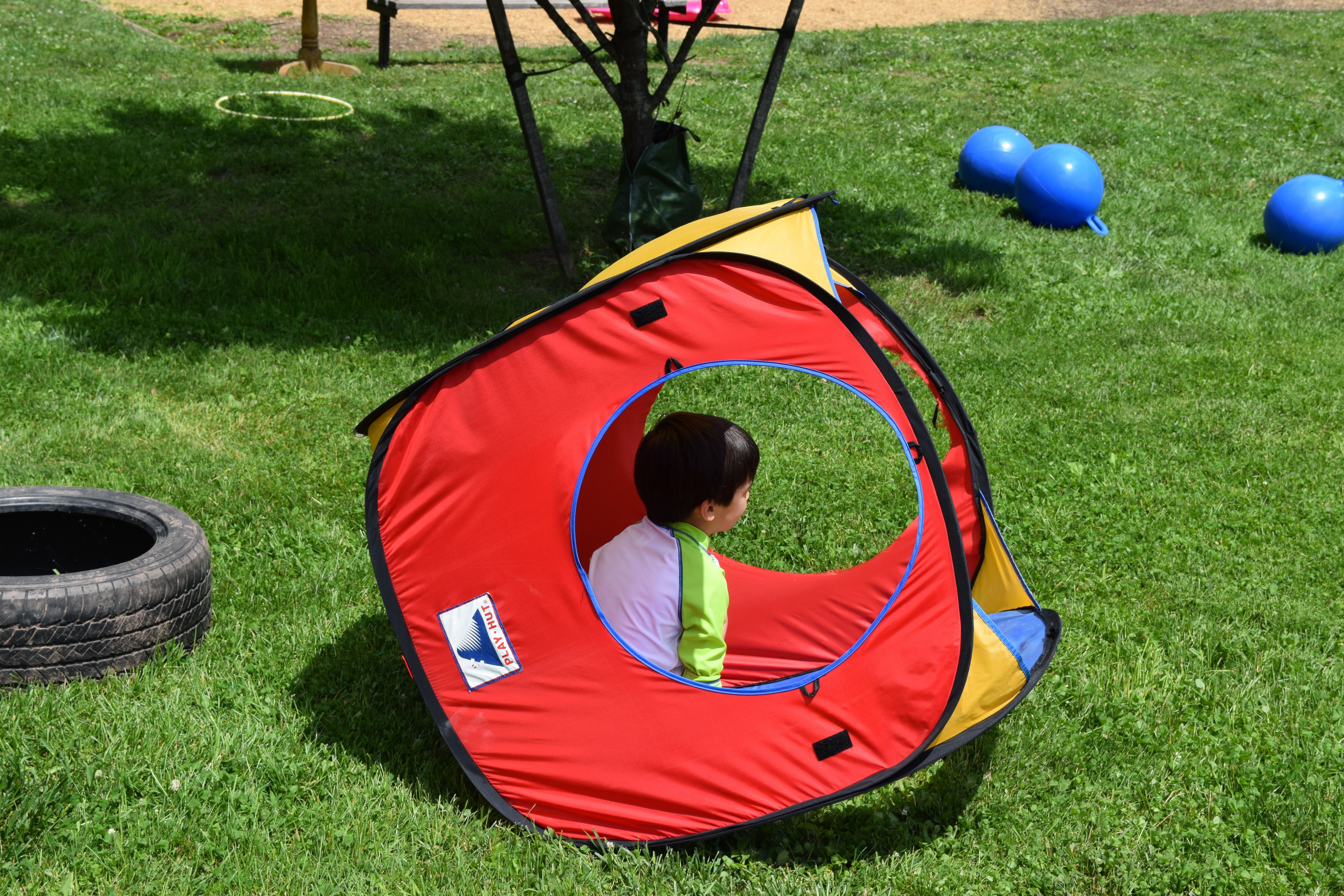 We sat on the parachute under a tree to read stories, sing songs, and play group games.