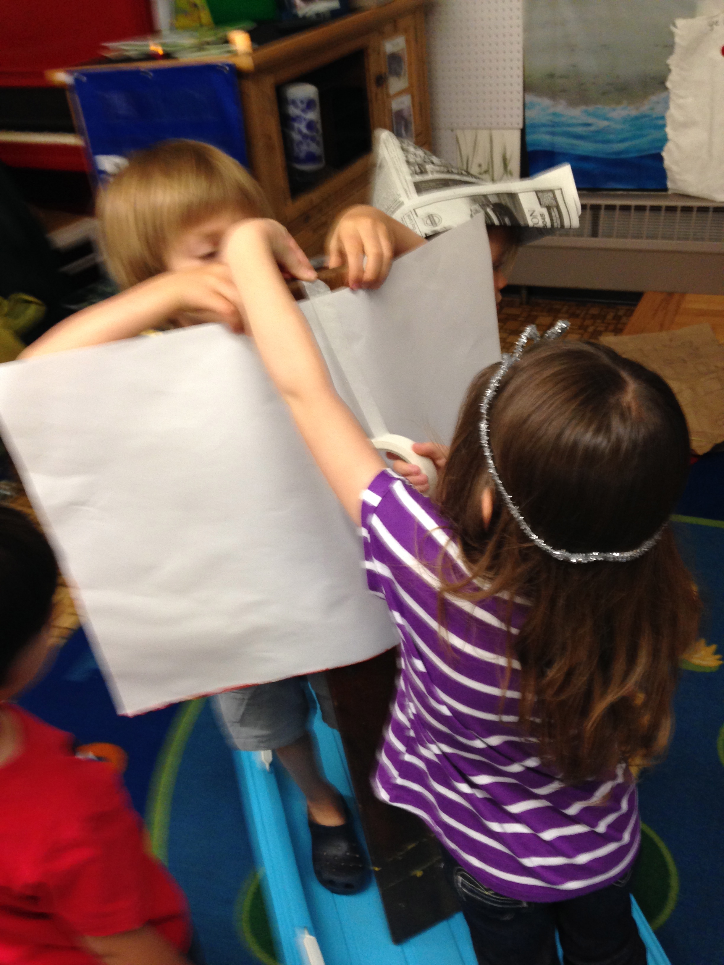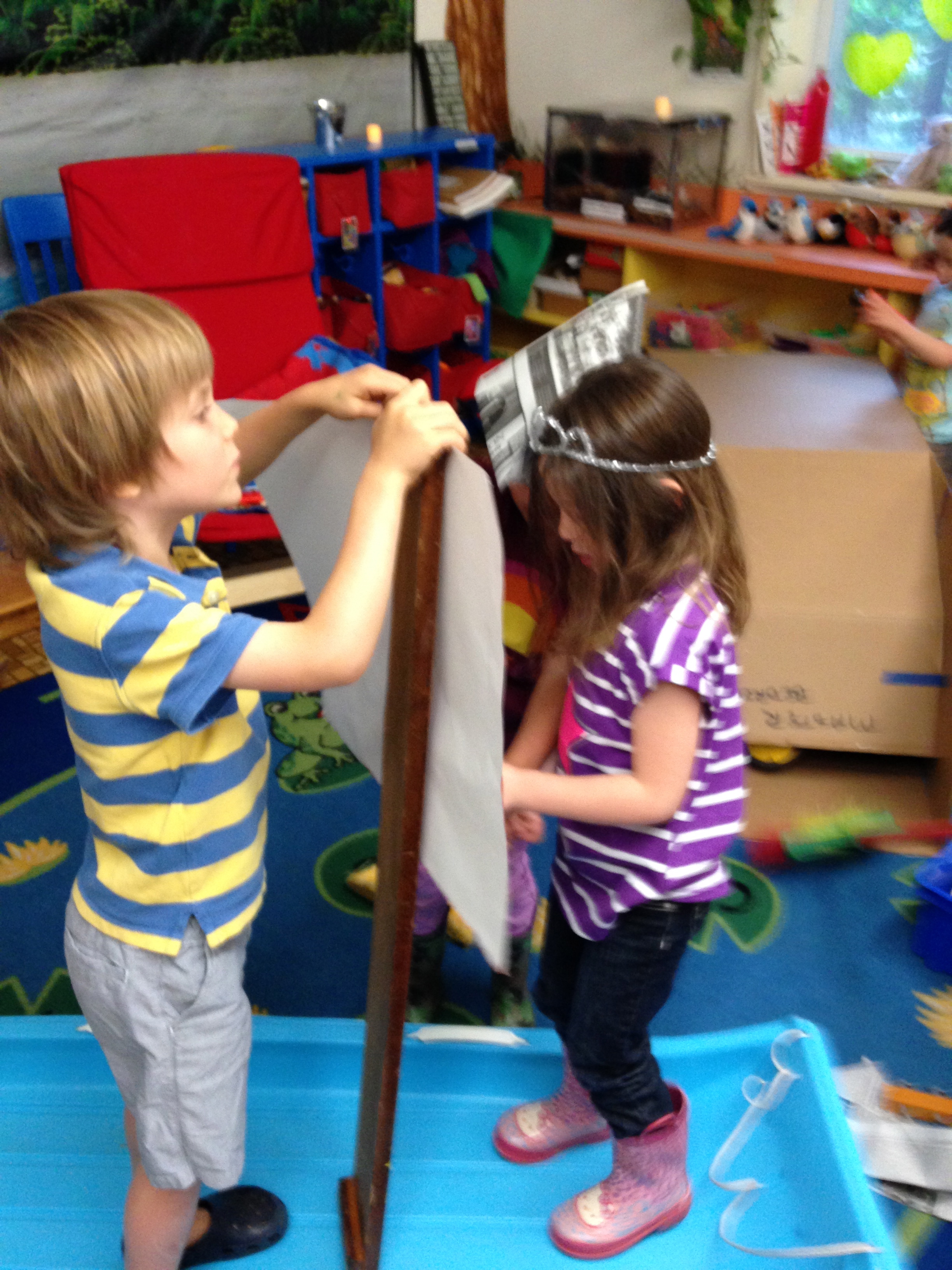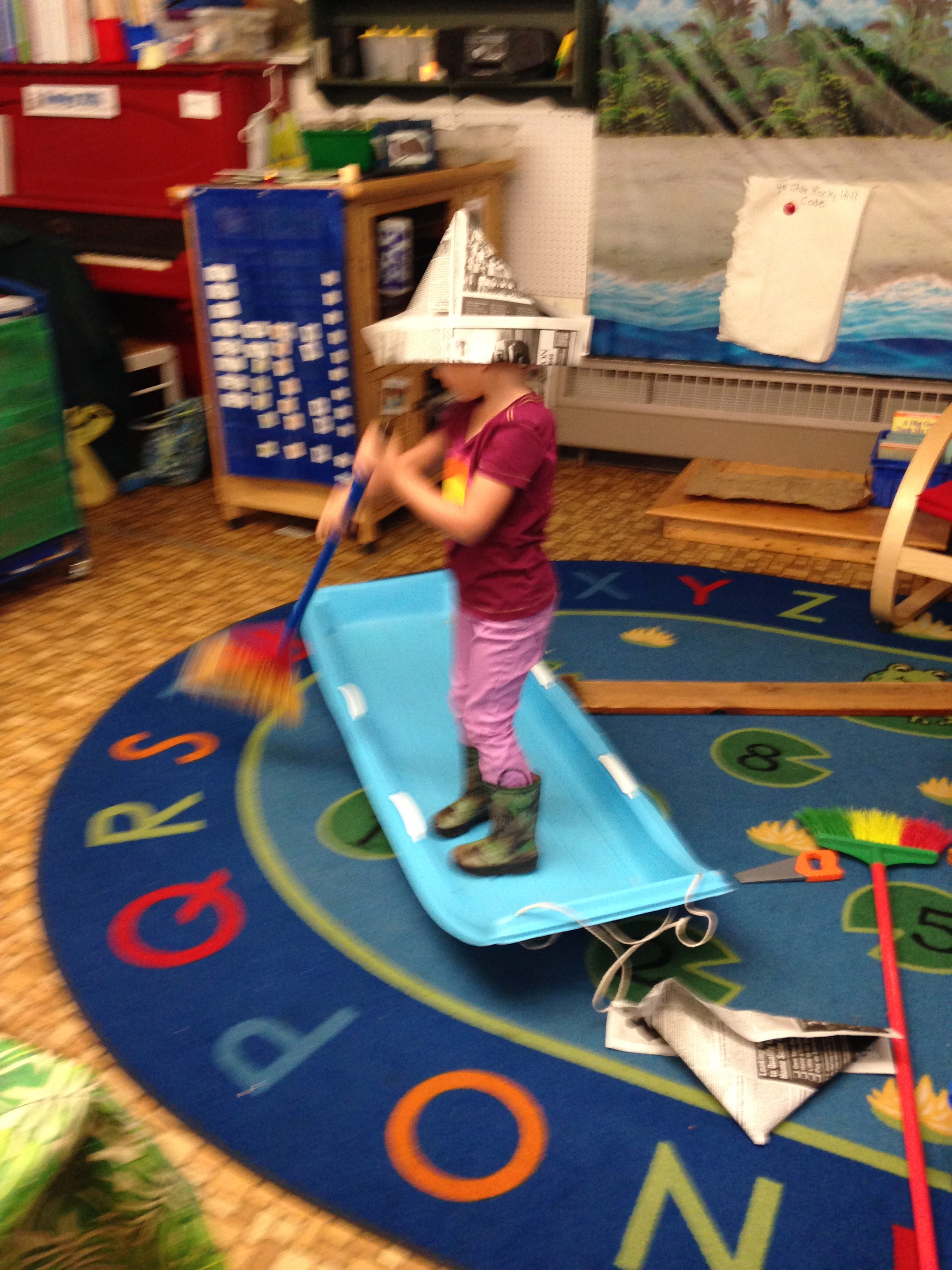 Ok, in my adult mind, I though they’d use the brooms for the mast.   I  was surprised when P held up the board like a mast, and said, “We need a sail.”  Some easel paper, lots of tape and there was a sail!