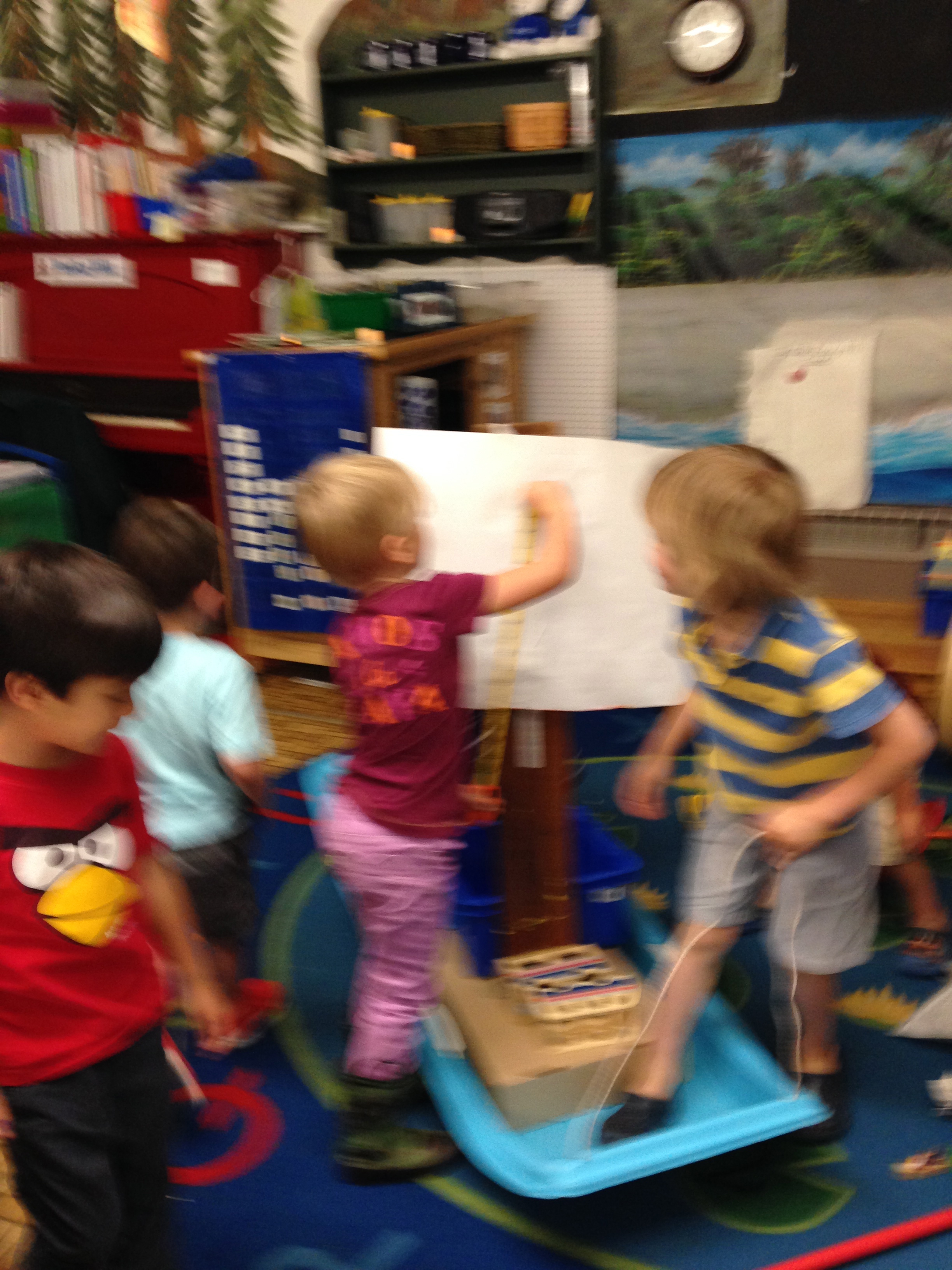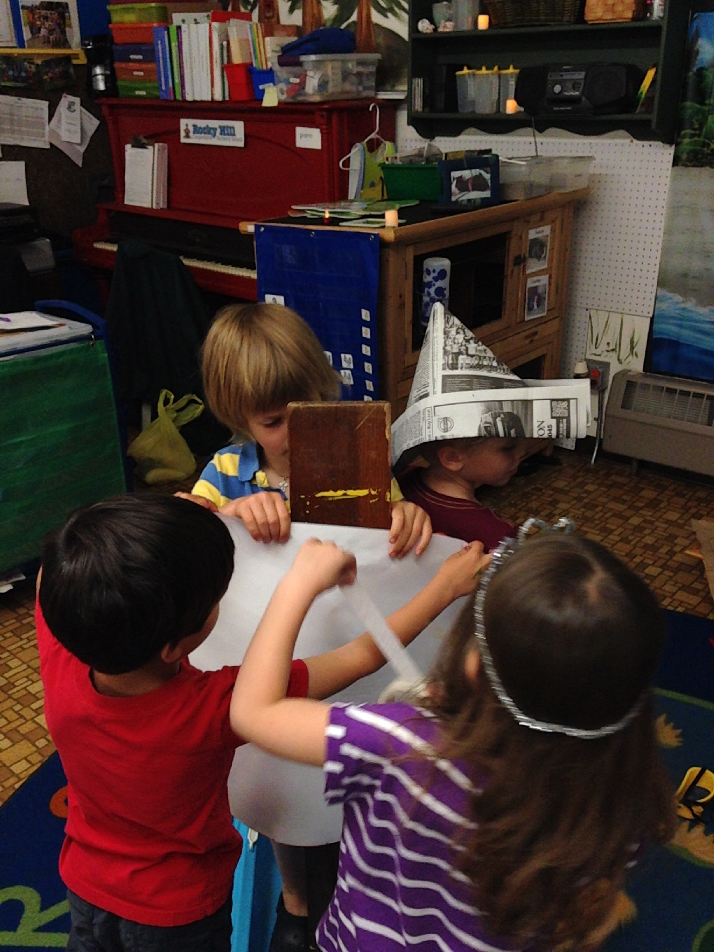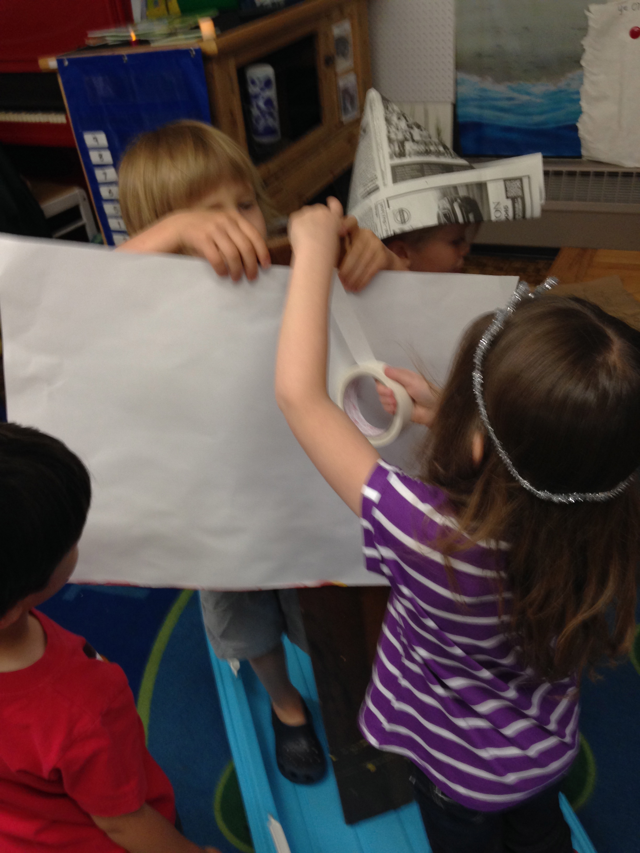 Ok, in my adult mind, I though they’d use the brooms for the mast.   I  was surprised when P held up the board like a mast, and said, “We need a sail.”  Some easel paper, lots of tape and there was a sail!
