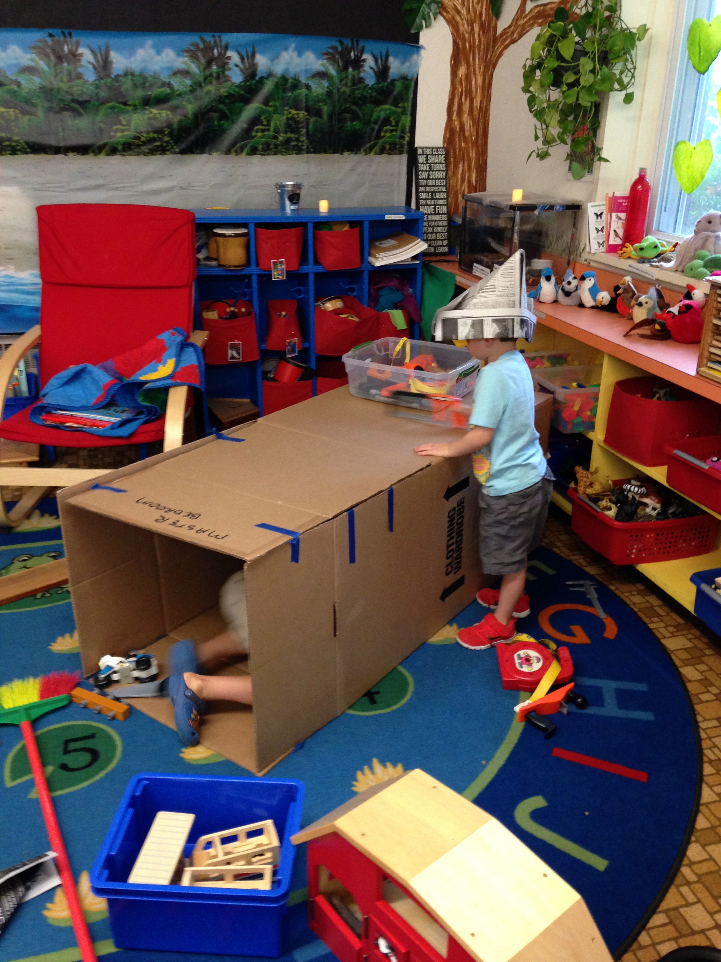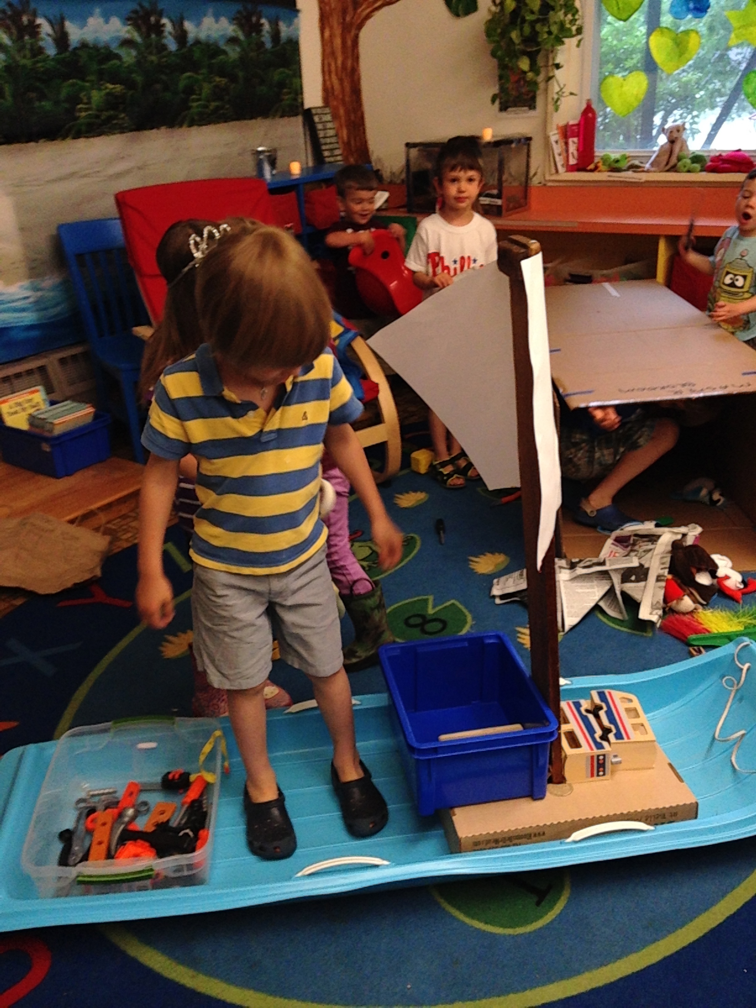 On the rug I put a long box, which I’d thought would be a boat, but I was told we needed a pirate cave, so a pirate cave it became!   I put out a toboggan and some brooms.  I realized I’d forgotten a plank, so I brought out our balance board.
